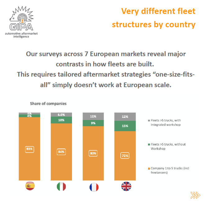 • In Italy and France, medium-to-large fleets represent a bigger share, but workshops integrated within fleets remain a minority.